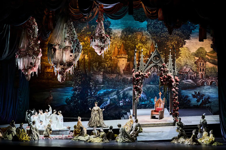 Слева: Переполненный зал Парижской оперы. На сцене идет большая опера Мейербера «Пророк». Справа: На сцене Парижской оперы идет III акт оперы «Гугеноты». Королева Маргарита останавливает дуэль.