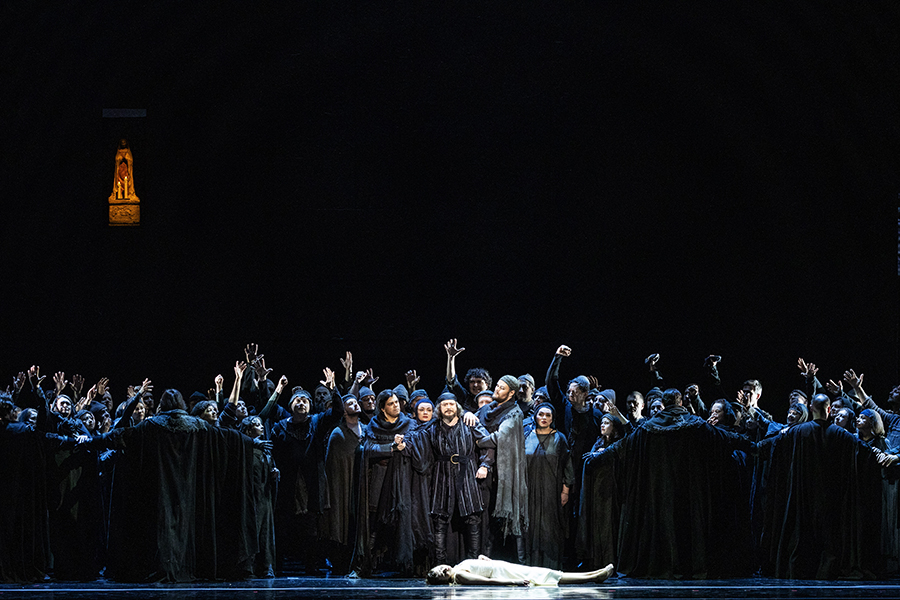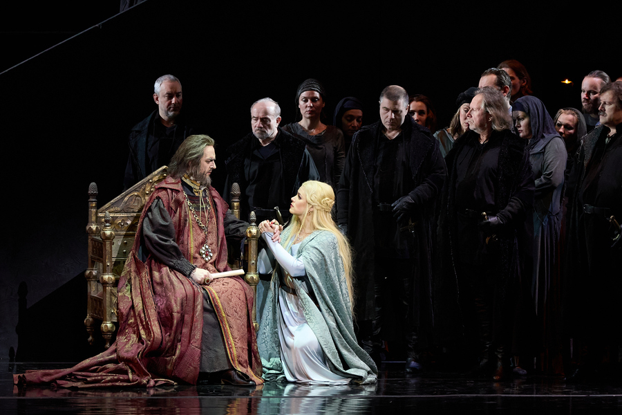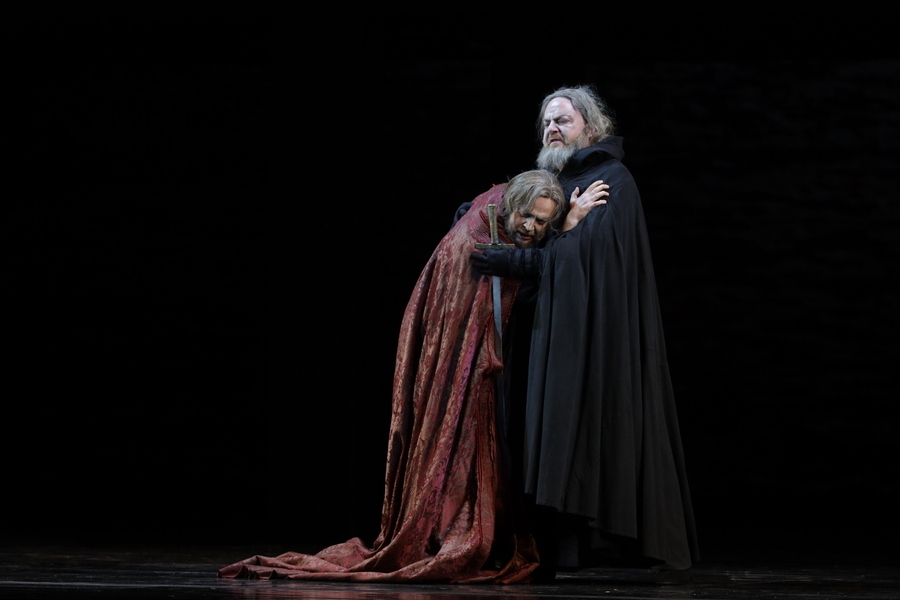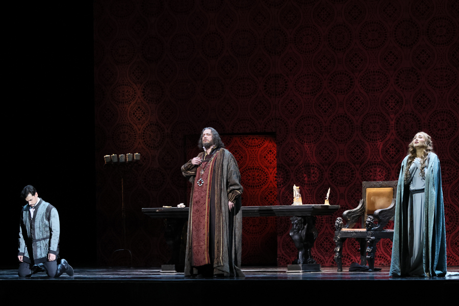 Andrea De Rosa’s production was brought to the Mariinsky Theatre from Italy’s Teatro Carlo Felice (Genoa) and Teatro La Fenice (Venice). It combines historical costumes with a minimalist set design: the greater part of the stage is occupied by a constantly changing black wall, on which at times doors open, at others Venetian windows of the Renaissance appear, and sometimes it is stripped down bare to its lattice-like structure. The deliberate conditionality of the space allows nuances of the acting to be highlighted, focussing on the complex interrelationships between the characters. Throughout the entire opera, a video is projected onto the stage backdrop depicting with staggering beauty views of the Ligurian Sea, and this accompanies the plot and reacts to it with changes in the lighting employed. The surface of the water here acts as the horizon to which Simon Boccanegra is inwardly striving, and it is a symbol of the freedom and purity of his soul. Denis Velikzhanin