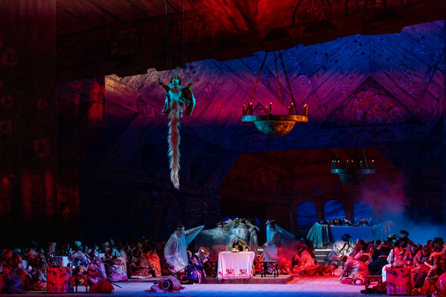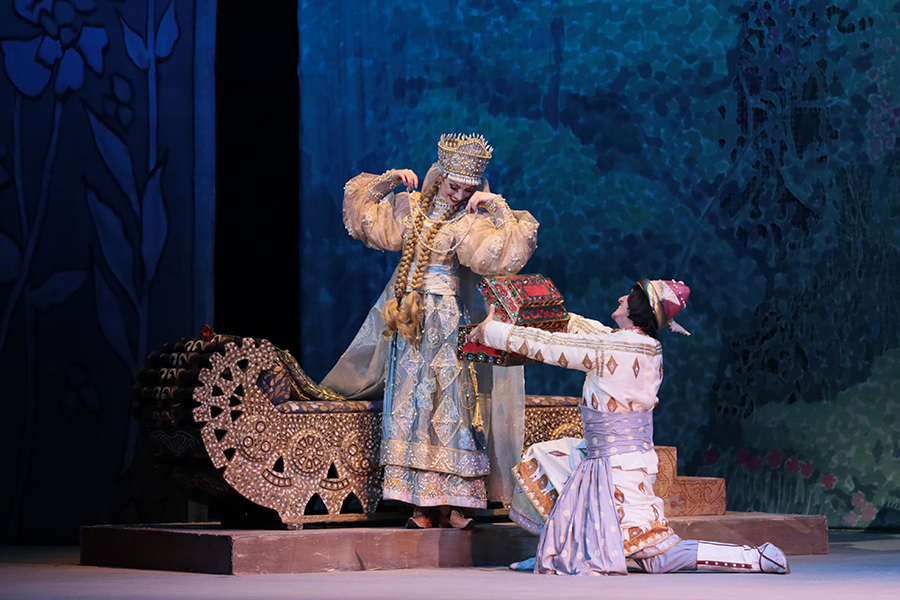 Слова Одоевского о «Руслане и Людмиле» можно отнести и к постановке этой оперы в Мариинском театре. Бельгиец Тьерри Боске месяцами работал в художественных мастерских театра, лично искал ткани для костюмов в магазинах по всему миру, стремясь спустя девяносто лет воспроизвести умопомрачительные краски и орнаменты легендарного спектакля 1904 года. Тогда, в год столетнего юбилея Глинки, над оформлением «Руслана» работали Константин Коровин и Александр Головин. Пышный русско-византийский модерн их сценографии поражает и сегодня, как в целом, так и в деталях, рассматривать которые – отдельное удовольствие. Картины оперы сменяют друг друга, словно страницы гигантской иллюстрированной книги сказок. Отдельного упоминания заслуживают танцы; они воскрешают другой юбилейный спектакль, 1917 года, когда в Мариинском театре праздновали 75-летие со дня первого представления «Руслана и Людмилы». Он шел в знакомых декорациях, но с новыми танцами Михаила Фокина. Ускользнувший от либреттистов пушкинский юмор вернулся в поставленных Фокиным танцах и шествиях, особенно – в кульминационном Марше Черномора.