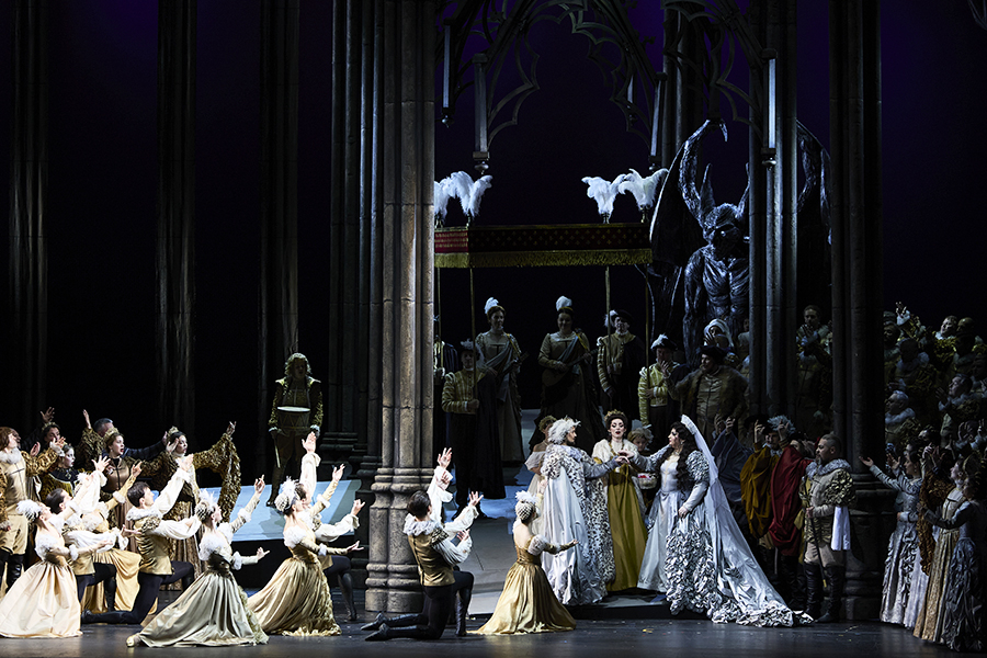 Прибывают дворяне-католики во главе с Невером и графом де Сен-Бри – отцом Валентины, предводителем католической знати; тут же являются гугеноты, среди которых Марсель. Обращаясь к обеим враждующим партиям, Маргарита говорит, что, вступив в брак с королем Наваррским, она надеется прекратить распри между католиками и протестантами. Все клянутся выполнять королевскую волю и соблюдать мир.