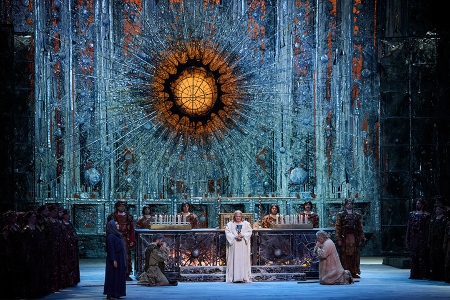 Рыцари Грааля собираются в храме замка. Амфортас, потрясенный смертью отца и мучимый совестью, молит покойного о заступничестве перед Господом, но опять отказывается совершить обряд и просит рыцарей убить его. В этот момент входит Парсифаль. Прикосновением копья он исцеляет рану Амфортаса. Амфортас, Гурнеманц и рыцари воздают новому повелителю Грааля королевские почести. Кундри обретает покой и прощение. Парсифаль приступает к священному обряду. Искупление свершилось.